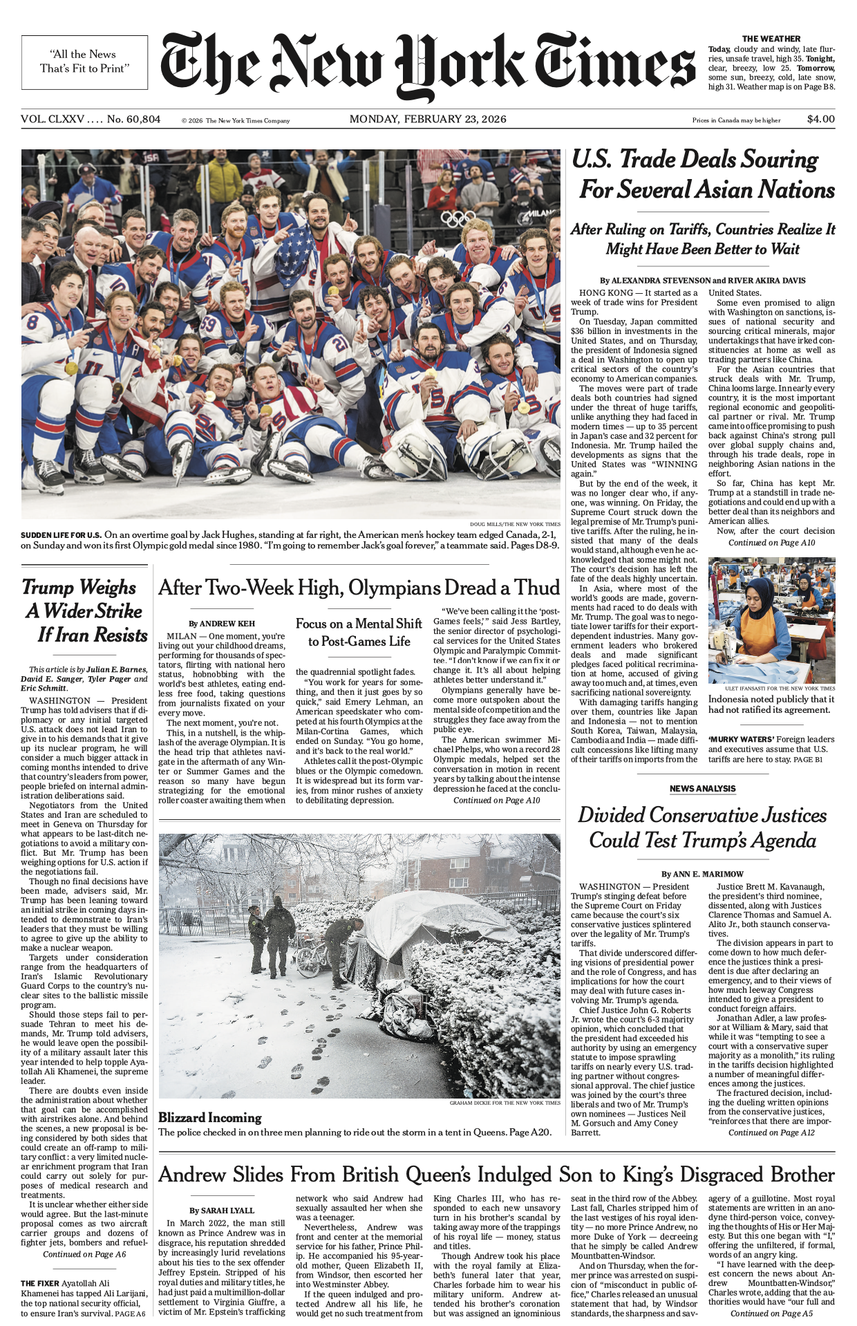 Tags: TereseAgnew , PortraitofaTextileWorker , textiles , MuseumofArtsandDesign , NewYork , NYTimes , womengarmentworkers , factories , Indonesia , U.S.TradeDealsSouring , ForSeveralAsianNations , AfterRulingonTariffs , SCOTUS , CountriesRealizeItMightHaveBeenBetterToWait , 'MurkyWaters' , Foreignleadersandexecutives , assumeU.S.tariffsareheretostay , U.S.Men'sHockeyTeam , SuddenLifeForU.S. , WinterOlympics2026 , overtimegoalbyJackHughes , edgedCanada2-1 , wonitsfirstOlympicgoldmedalsince1980 , redwhitebluehockeyuniforms , goldmedals , post-Olympic blues , AfterTwo-WeekHighOlympiansDreadaThud , FocusonaMentalShifttoPost-GamesLife , TrumpWeighsWiderStrikeIfIranResists , negotiationsscheduledinGeneva , AyatollahAliKhameneihastappedAliLarijani , topnationalsecurityofficialtoensureIran'ssurvival , AndrewMountbatten-Windsor , Epsteinfiles , AndrewSlidesFromBritishQueen'sIndulgedSon , toKing'sDisgracedBrother , blizzardconditions , windy , snow , lateflurries , unsafetravel